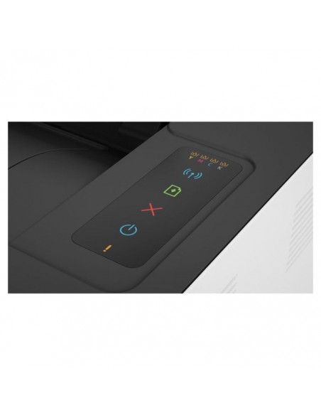 Imprimante Laser HP 150NW Couleur WIFI - Fonctions: Impression - Technologie d'impression: Laser - Vitesse d impression: 18ppm(noir) ; 4 ppm (couleur) - Résolution d'impression(noir;couleur): Jusqu'à 600 x 600 ppp - Format Papier: A4 - Ecran: Voyant - Capacité d'entrée papier: 150 feuilles - Mémoire: 64 Mo - Impression recto verso: Manuel - Format compacte - Simplicité d'installation - Tailles de support personnalisées: 76 x 148,5 à 216 x 356 mm - Connecteurs: Port USB 2.0 haut débit, port réseau Fast Ethernet 10/100Base-TX, sans fil 802.11 b/g/n - Dimensions: 382 x 309 x 211,5 mm - Poids: 10,04 kg - Couleur: Blanc -Avec Cartouches échantillons P 117A préinstallées pour imprimante laser (700 pages en noir, 500 pages en cyan, jaune, magenta).
