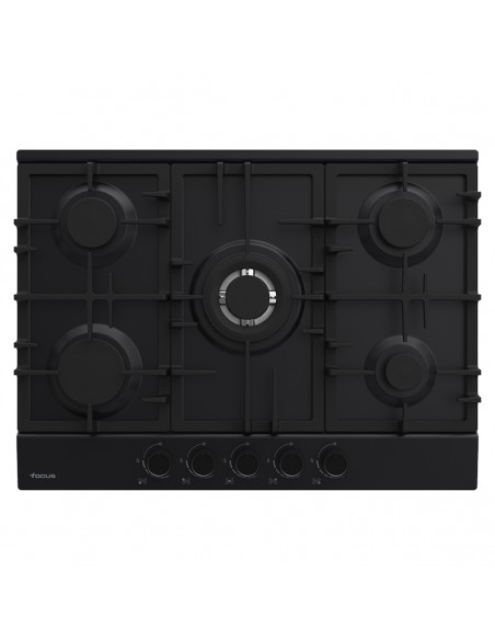 Plaque de cuisson Focus F.478B - Largeur: 70 CM - 5 brûleurs à gaz, l’un triple couronnes - Flamme stabilisée - Grilles et chapeaux de brûleurs en fonte - Allumage automatique - Commandes frontales - Dimensions: 520 x 690 x 51 mm - Couleur Noir - Garantie 2 ans
