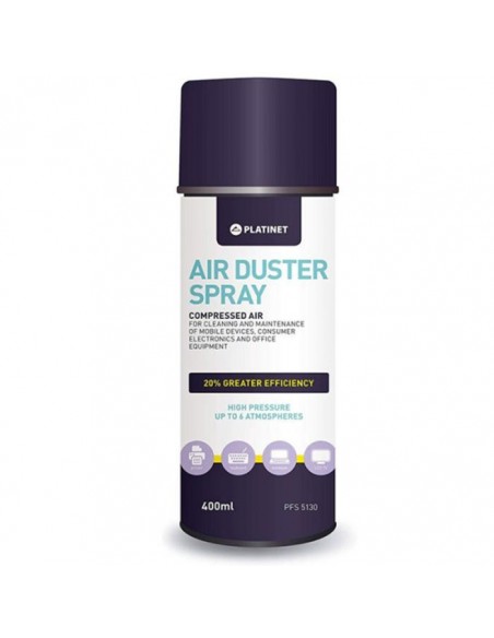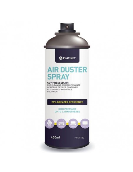 Air Comprimé PLATINET Pour écrans - Capacité: 400 ml - Bombe a air comprime pour nettoyer votre equipement informatique et vos autres appareils electroniques - Facilite le depoussierage dans les endroits difficiles a atteindre - Recommande pour le nettoyage: Caisses enregistreuses, ordinateurs (nettoyage des claviers, des boîtiers d'ordinateurs) - Buse à air en plastique pratique