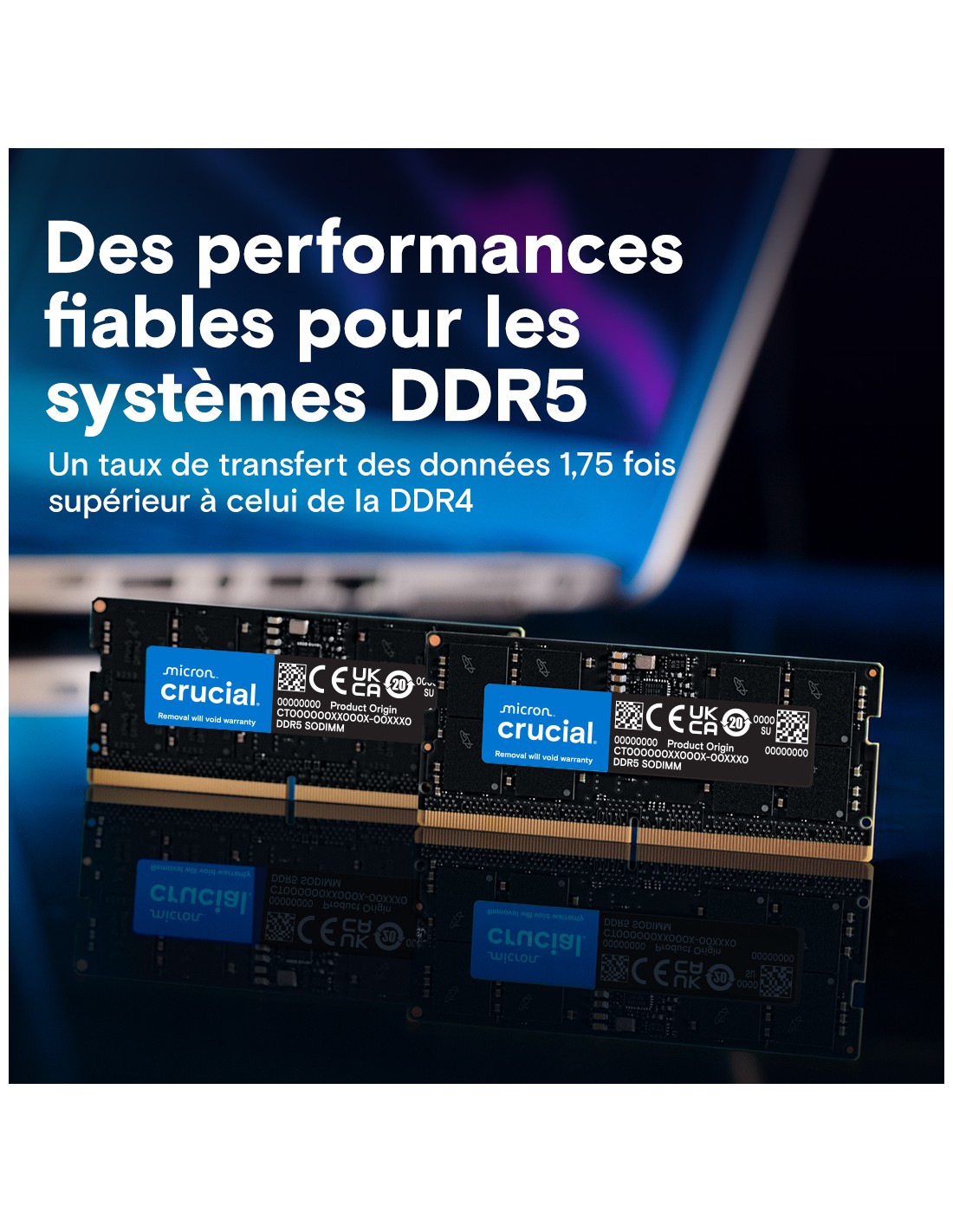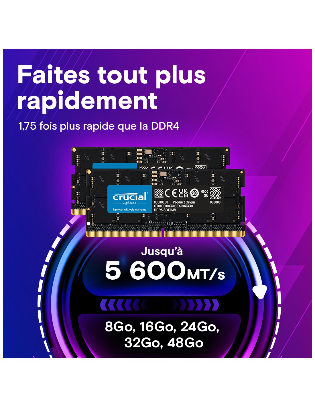 La DDR5 offre une vitesse supérieure et une meilleure efficacité énergétique. La RAM Crucial 8Go DDR5-5600 SODIMM est donc plus rapide et adaptée aux applications exigeantes.