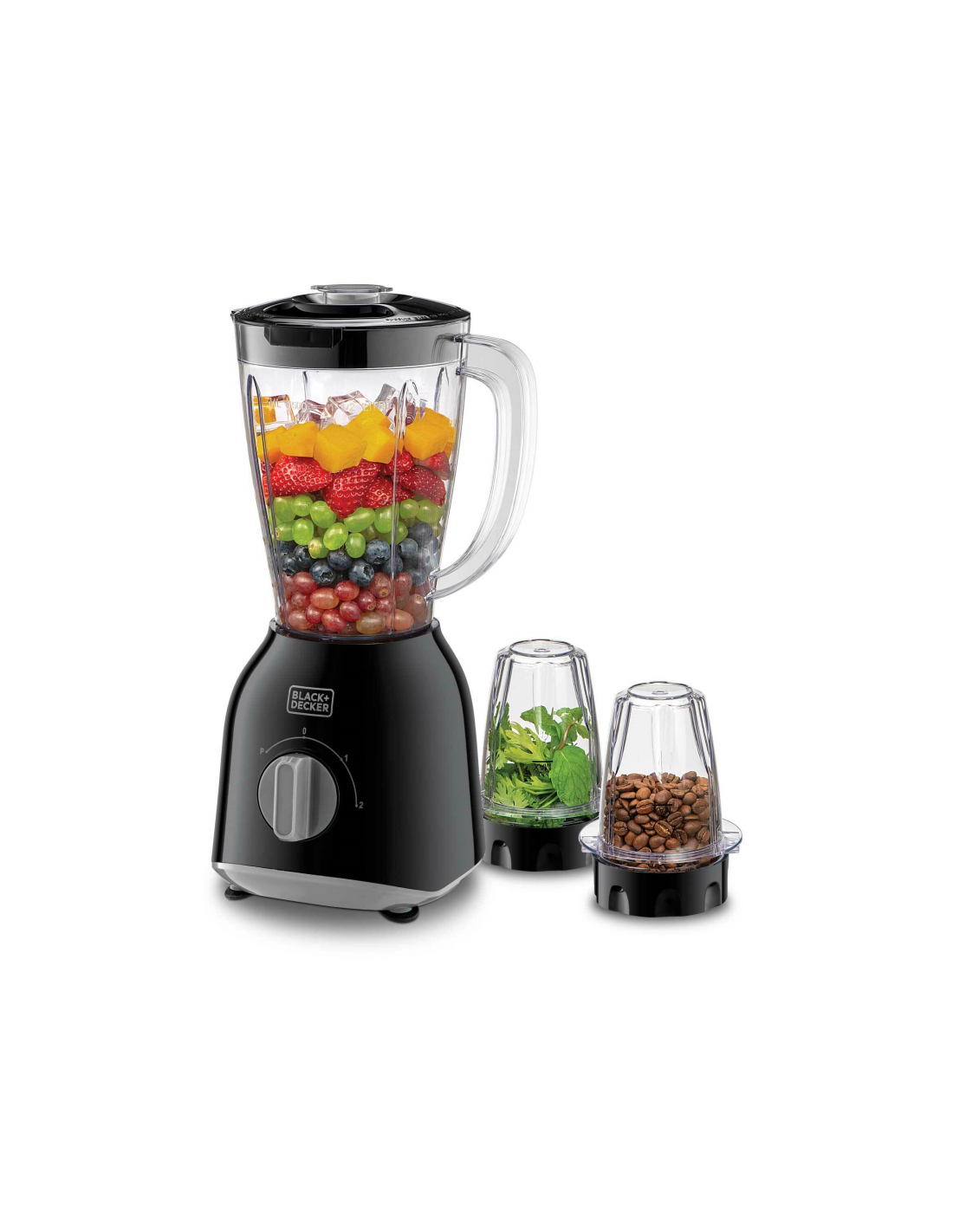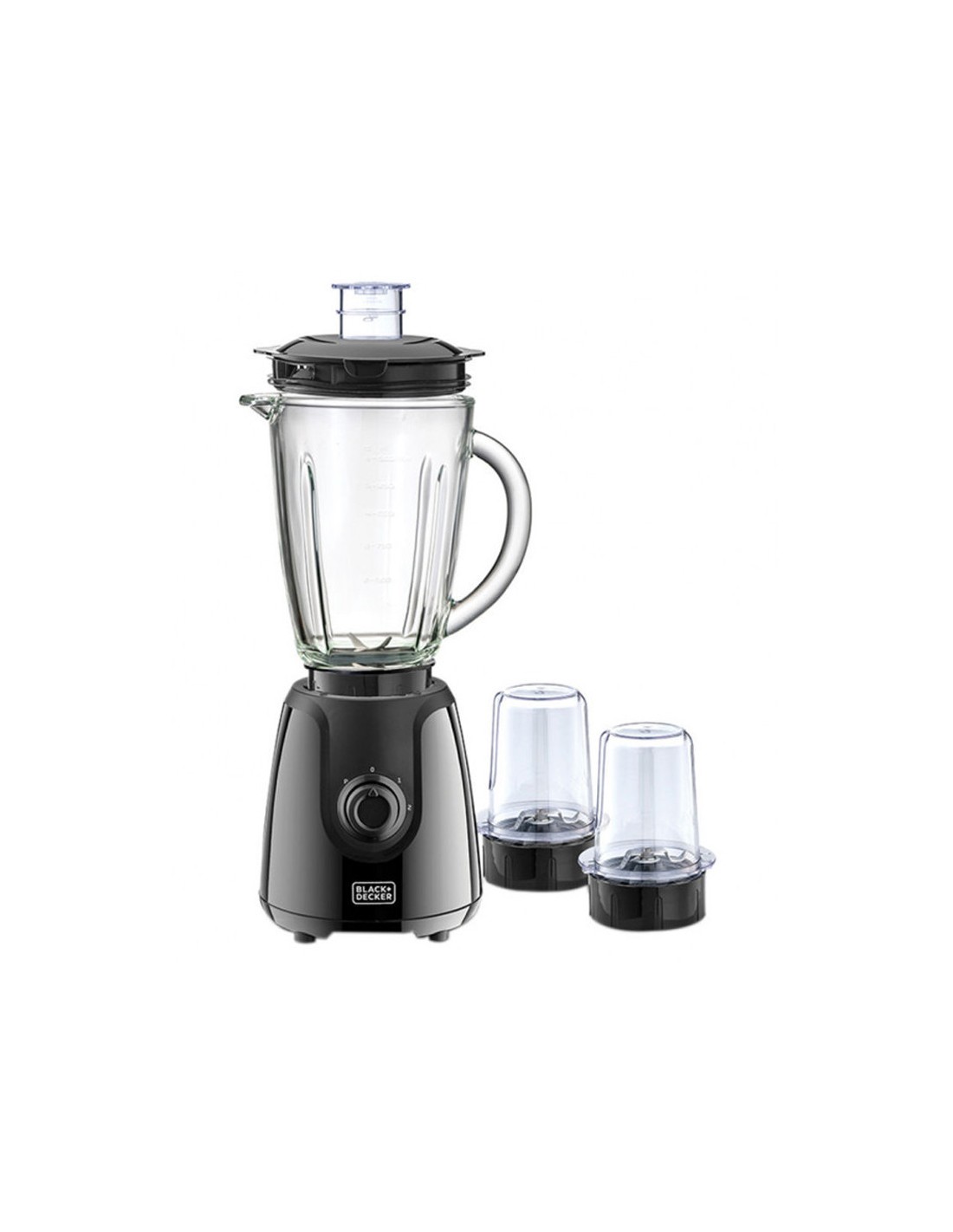 Blender Black + Decker 3en1 - Puissance: 400 Watts - Capacité du Bol: 1.5 Litres - Matière du Bol Plastique - Lame en acier inoxydable - Nombre de vitesses: 2 vitesses avec fonction d'impulsion - Fonctions: Moulin à café pour le café, les herbes et les épices , Moulin à hacher pour viande, pomme de terre et fromage à pâte dure - Verrouillage de sécurité sur le couvercle et la base - Pieds antidérapants - Couleur: Noir - Garantie: 1 an