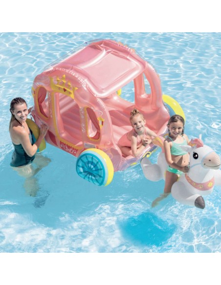 Carrosse de Princesse gonflable Intex - Utilisable en intérieur comme en extérieur -Dimension Carrosse : 145*135*104 cm - Dimension Cheval : 124*58*66cm -Peut contenir 2 enfants (3 ans ou plus ) et supporte un poids Max : 100Kg - Matière : PVC - Couleur Carrosse : Rose - Couleur Cheval : Blanc - Le plancher du chariot est gonflable, dispose de 6 poignées robustes, en vinyle de 0,30 mm d'épaisseur -Comprend un patch de réparation pour réparer d'éventuels trous ou crevaisons.