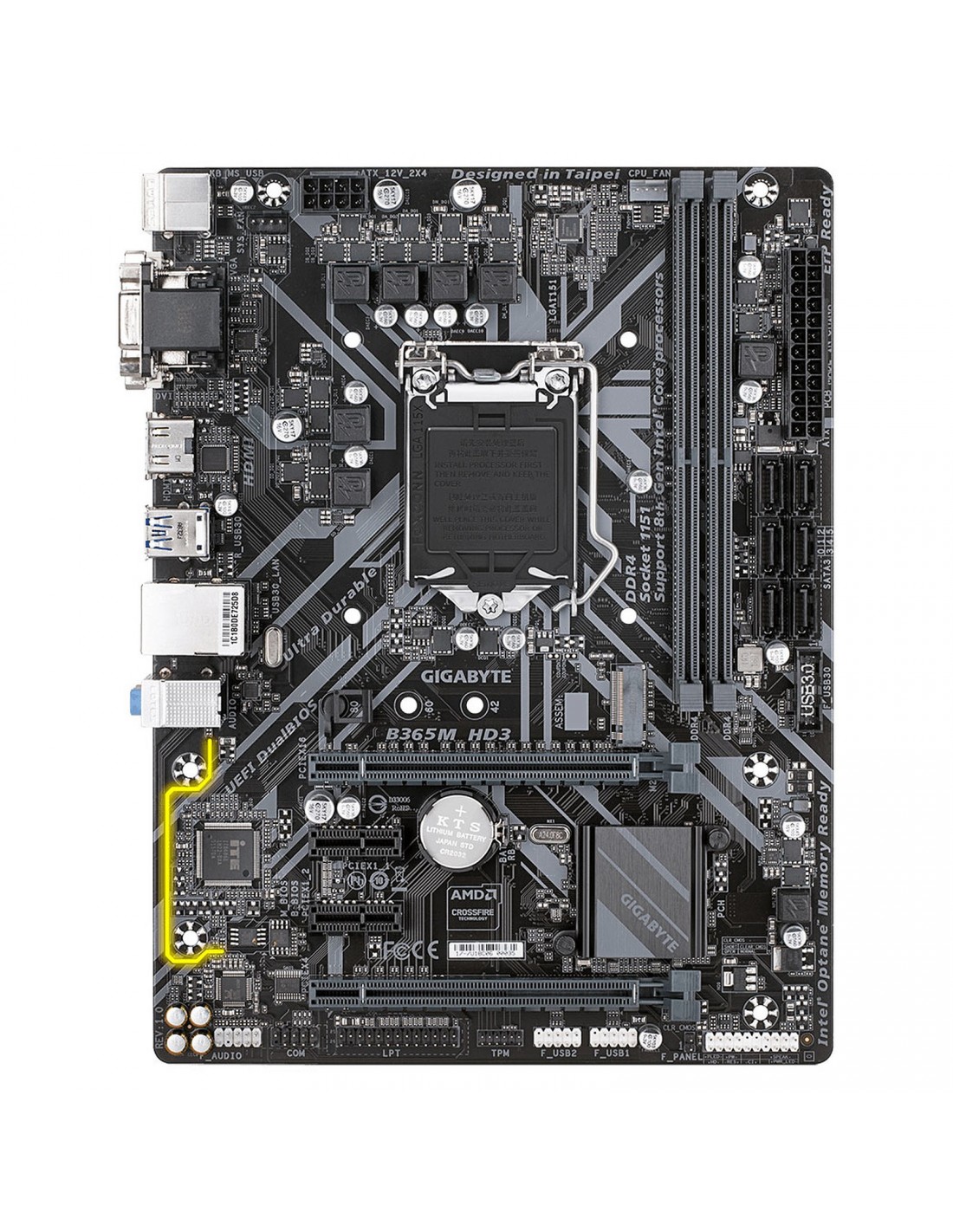 Réf : B365M-HD3 - Prise en charge des processeurs Intel Core de 8ème et 9ème génération sur socket 1151,Supports de la mémoire vive DDR4 (32 Go max.),1 ports PCI-Express 3.0 16x,6 ports SATA 6 Gbps + 1 port M.2 (PCIe Gen3 x4 et SATA 6 Gbps),Ports USB 3.0,3 sorties vidéo : HDMI, DVI-D et VGA,Audio HD ALC 887,Réseau Gigabit Lan