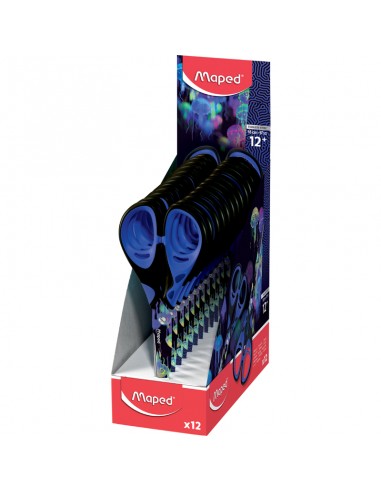 Ces Ciseaux Maped sont proposés en présentoir de 12 unités, convenant parfaitement pour un usage en classe, au bureau ou à domicile.