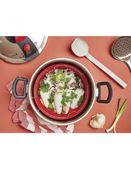 Cocotte Sitram Sitrapro de couleur inox et fushia. Autocuiseur rond 6L en inox 18/10 avec panier rouge de Ø 24 cm, doté d'un système de décompression anti-brûlure et d'ouverture à crémaillère. Il est également équipé d'un joint en silicone. Le fond épais indéformable assure une diffusion optimale et homogène de la chaleur. De même, ce cocotte de marque Sitram se caractérise par 4 points de sécurité pour un verrouillage sécurisé. Autocuiseur livré avec un panier vapeur en silicone perforé rouge muni de 2 anses inox qui facilitent l'extraction et la stabilité. Ensuite, La présence d'une cuillère 2 en 1 facilite la préhension du panier vapeur grâce à son manche en forme de crochet. En effet, la forme de cet appareil est spécialement étudiée pour préserver la propreté du plan de travail.