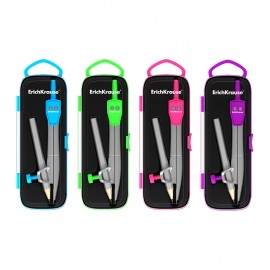 Compas en métal avec crayon ErichKrause® - Réf : 45026 - Le rayon maximal est de 18,5 cm. Le support universel permet d'utiliser pour dessiner différents accessoires d'écriture. Présenté dans des couleurs néon vives. L'emballage est un boîtier en plastique avec cintre.