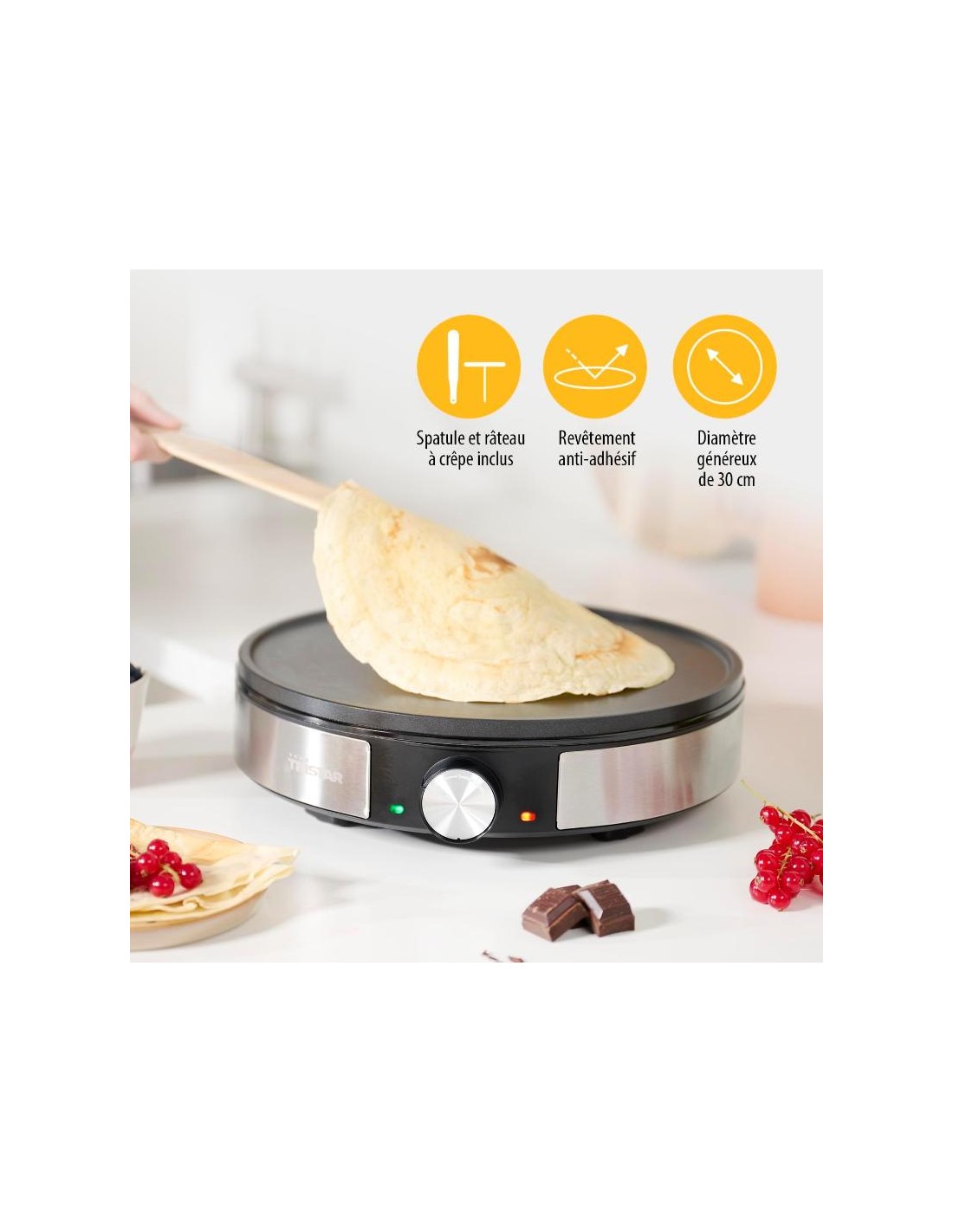 Sa crêpière puissante 1200W garantit une cuisson rapide et homogène, idéale pour un usage domestique régulier.