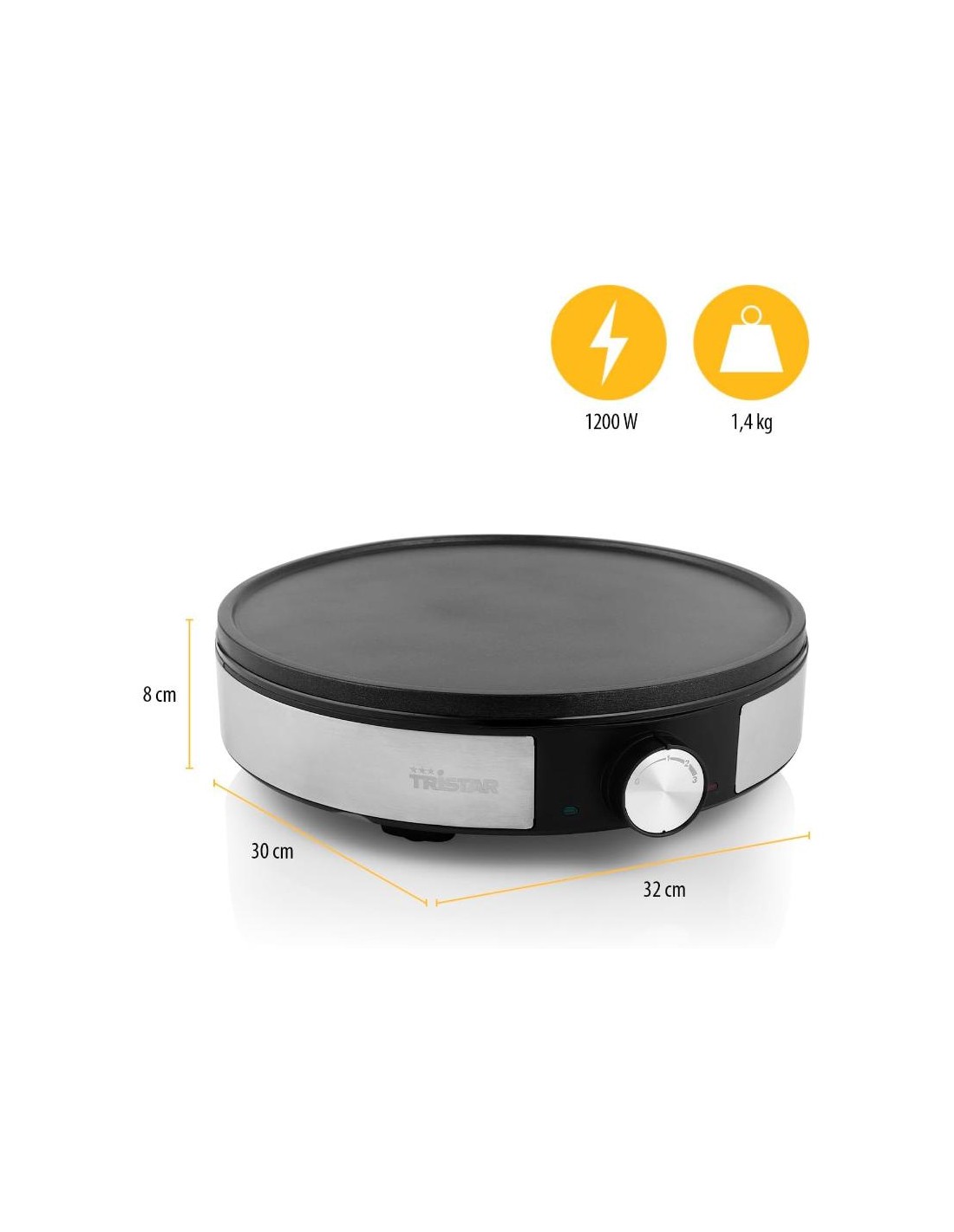 La Tristar BP-2638 , Crêpière électrique vous permet de préparer facilement des crêpes fines, dorées et parfaitement cuites à la maison. Équipée d’une plaque de 30 cm et d’une puissance de 1200W, cette crêpière électrique garantit une montée en température rapide et une diffusion homogène de la chaleur.