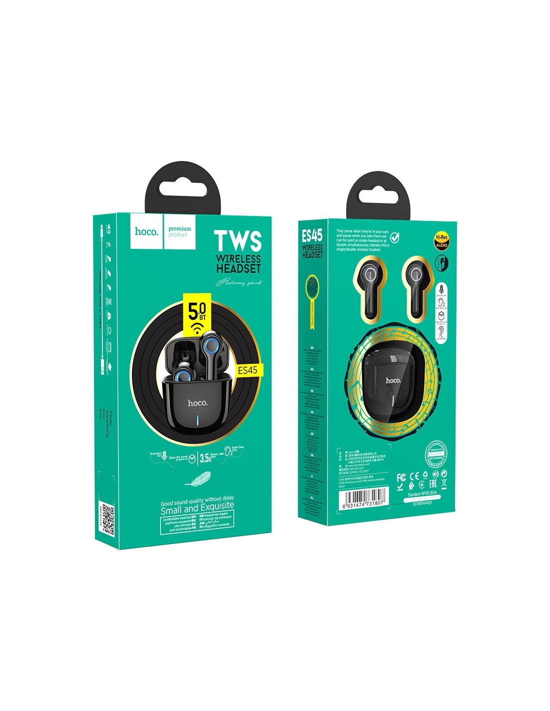Ecouteur Bluetooth HOCO ES45 - Réf : ES45-BK - Bluetooth 5.0 - Puce JL AC6936D - Capacité de la batterie 320mAh - écouteurs unique 30mAh - Temps d'appels et musique 3.5 heures - Autonomie en veille 180 heures - Temps de charge 1 heure - Détection intra-auriculaire - Fenêtre pop-up pour Apple - Détection intra-auriculaire - Poids total 37g - Couleur Noir