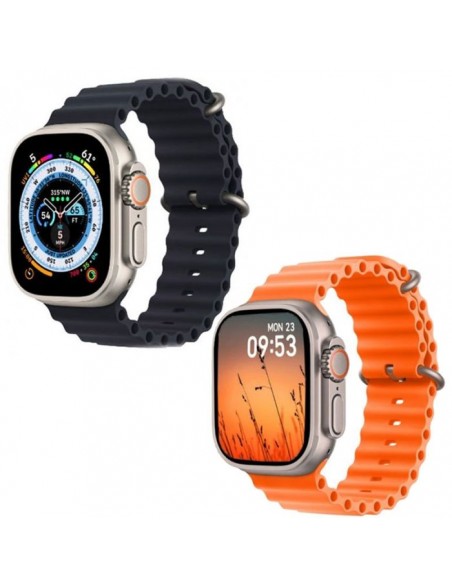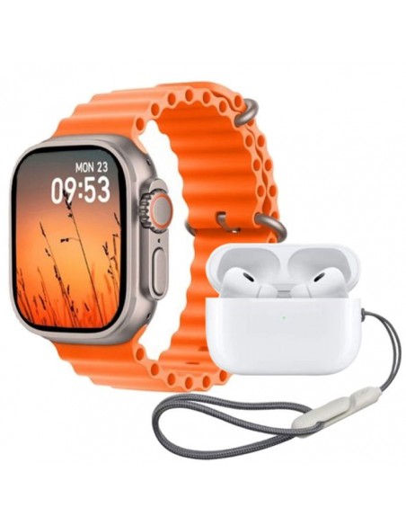 Ensemble Haino Teko GP8 - Montre Connectée: Écran Couleur 2.2" IPS (320x 380 pixels) - Connectivité: Bluetooth 5.0 - Appel Bluetooth - Capteur Spo2, moniteur de fréquence cardiaque - Mode multisports - Capacité de batterie: 200 mAh - Autonomie: 2 à 5 jours, jusqu'à 7 jours en veille - Étanche IP68 - 2 bracelets: Noir et orangé - Airpod: Connectivité: Bluetooth - Couleur: Blanc - Garantie: 3 mois