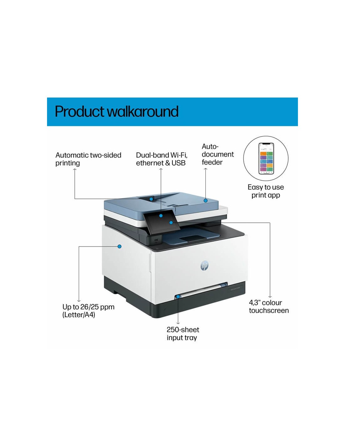 L'HP 3303sdw Multifonction LaserJet PRO se distingue par sa rapidité et sa simplicité d'utilisation. Profitez d'une impression couleur HP de qualité professionnelle et d'une connexion Wi-Fi fiable pour imprimer depuis n'importe quel appareil. Cette imprimante HP multifonction permet de scanner, copier et imprimer efficacement, augmentant la productivité de votre bureau tout en conservant une qualité optimale.
