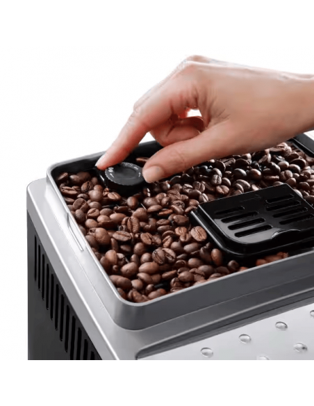La Magnifica S ECAM21.117.B de DeLonghi allie esthétique et performance pour offrir une expérience café inégalée à la maison, avec son corps noir brillant et sa finition argent.