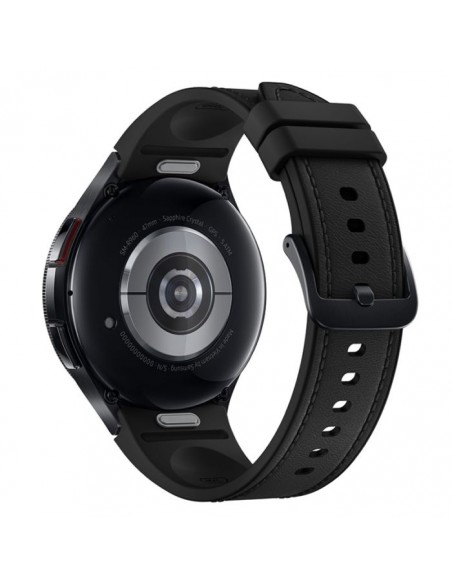 Écran 1,5'' Super AMOLED (480 x 480pixels) Verre en cristal de saphir - Processeur: Dual Core 1,4GHz- Système d'exploitation: Wear OS - Mémoire: 2Go - Stockage interne: 16Go - Batterie: 425mAh - Autonomie en utilisation typique: Jusqu'à 40 heures - Appel Bluetooth et notifications - Détection de chute (détecte si tu as fait une chute et envoie un SOS d’urgence) - Suivi du sommeil - Composition corporelle - Capteur de température infrarouge - NFC - GPS - Connectivité: WiFi 802.11 a/b/g/n 2,4+5 GHz,Bluetooth 5.3 - Matériau: Acier inoxydable - Resistance à l'eau: IP68, 5ATM - Couleur: Noir - Garantie: 1an