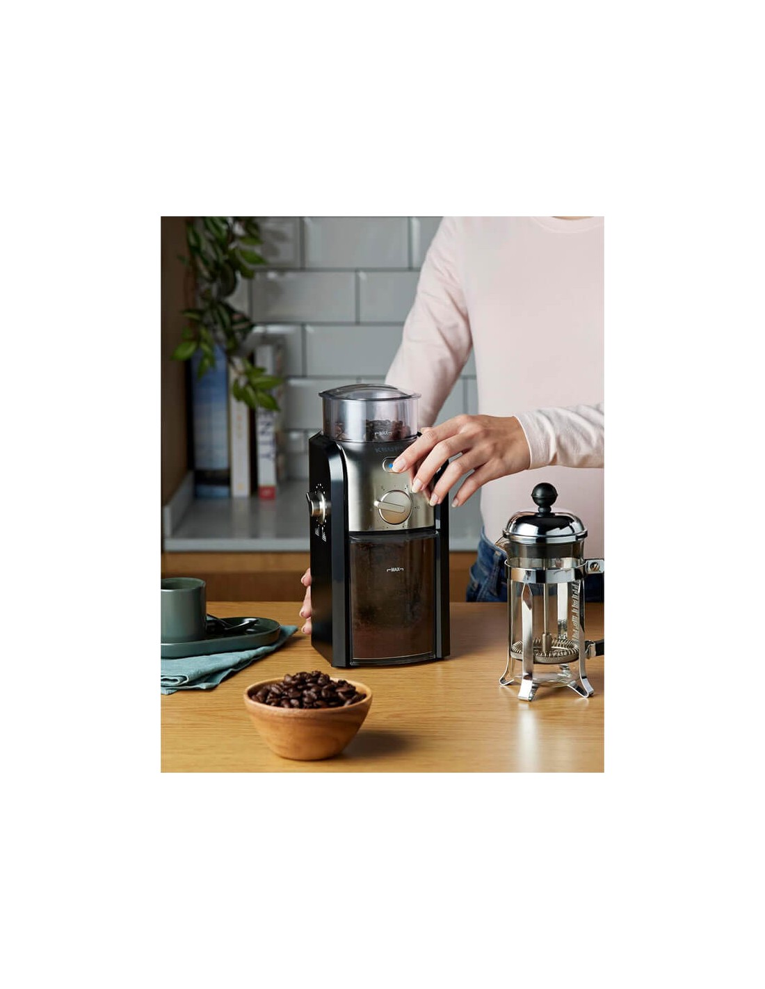 Le bac à grains peut contenir jusqu’à 200 gr, idéal pour un usage domestique et pour moudre suffisamment de café pour plusieurs tasses.