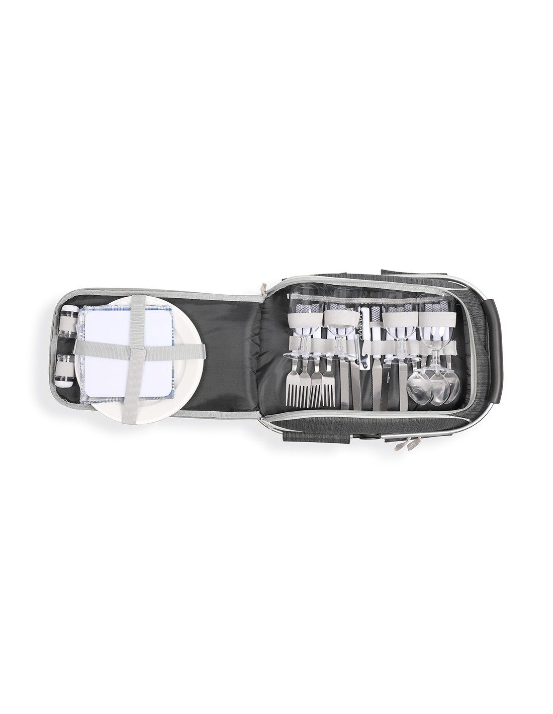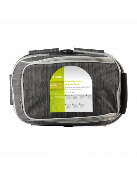 4 personnes Grand compartiment principal isotherme de 23 litres Toile renforcée polyester 600D Grande poche matelassée avec 29 accessoires inclus : 4 fourchettes inox poignée PP, 4 cuillères inox poignée PP, 4 couteaux inox poignée PP, 4 assiettes, 4 verres en plastique, 4 serviettes en non tissé, 1 tire-bouchon, 1 couteau à fromage, 1 planche à découper, 1 salière et 1 poivrière Fermeture éclair double sens Poignée de transport pliable et détachable en aluminium avec protection en mousse