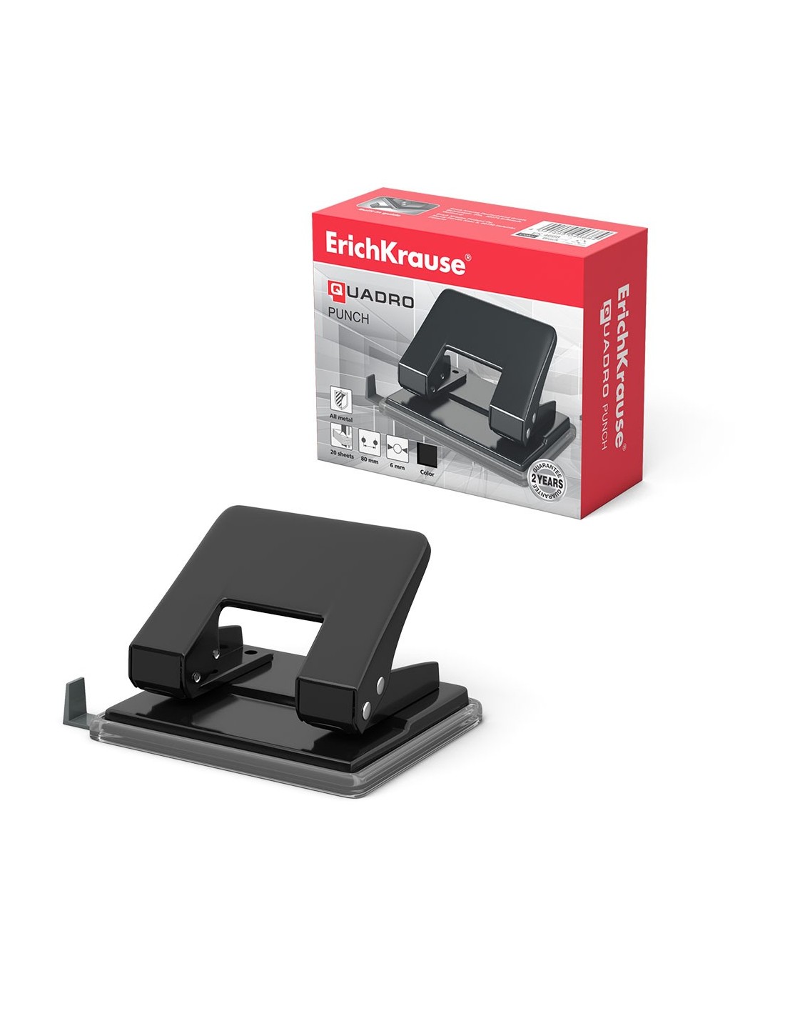 Perforeuse ErichKrause® Quadro - 20 feuilles - Réf : 4594 - Perforatrice avec bac à confettis et règle intégrée pour le choix du format. Perfore jusqu'à 20 feuilles. Corps et mécanisme en acier de haute qualité. Mécanisme garantie 2 ans. Les lames affûtées perforent facilement une quantité maximale de feuilles. Le coussin de base en plastique empêche la surface de la table de se rayer et aide à éviter le glissement du poinçon. Butée intégrée pour le stockage en position repliée. Le diamètre du trou est de 5,5 mm