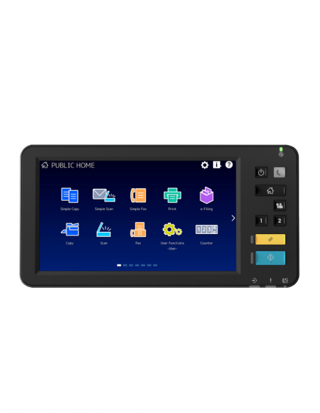 Ce photocopieur offre des fonctions d'impression, de copie, de scan, et en option, de fax.
