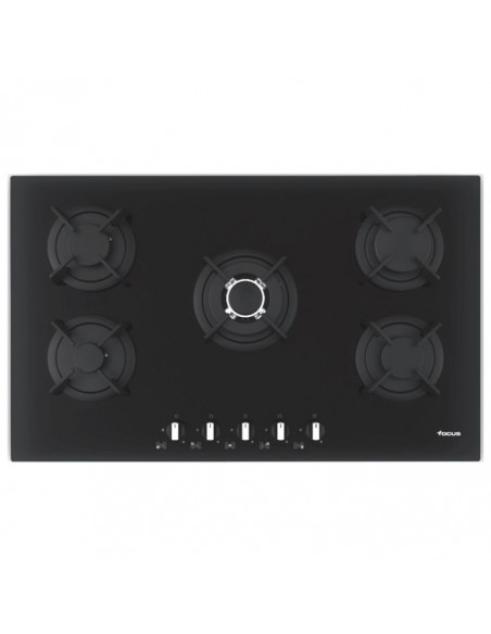 Plaque de Cuisson Encastrable FOCUS - Type de Plaque: à Gaz - Largeur: 90 cm - Nombre de Foyers: 5 Foyers à Gaz - Thermocouple - Flamme stabilisée - Grilles et chapeaux de brûleurs en fonte - Allumage Automatique - Commandes frontales - Sécurité gaz sur chaque brûleur - Couleur: Noir - Garantie: 2 ans