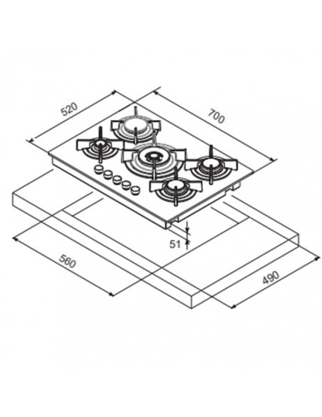 Plaque de Cuisson Encastrable FOCUS - Type de Plaque: à Gaz - Largeur: 70 cm - Nombre de Foyers: 5 Foyers à Gaz dont un brûleur à triple couronne - Thermocouple - Grilles et chapeaux de brûleurs en fonte - Flamme stabilisée - Allumage Automatique - Commandes frontales - Revêtement: Vitrocrystal - Sécurité gaz sur chaque brûleur - Couleur: Noir - Garantie: 2 ans .
