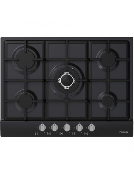 Plaque de Cuisson Encastrable FOCUS - Type de Plaque: à Gaz - Largeur: 90 cm - Nombre de Foyers: 5 Foyers à Gaz - Thermocouple - Flamme stabilisée - Grilles et chapeaux de brûleurs en fonte - Allumage Automatique - Commandes frontales - Sécurité gaz sur chaque brûleur - Couleur: Noir - Garantie: 2 ans