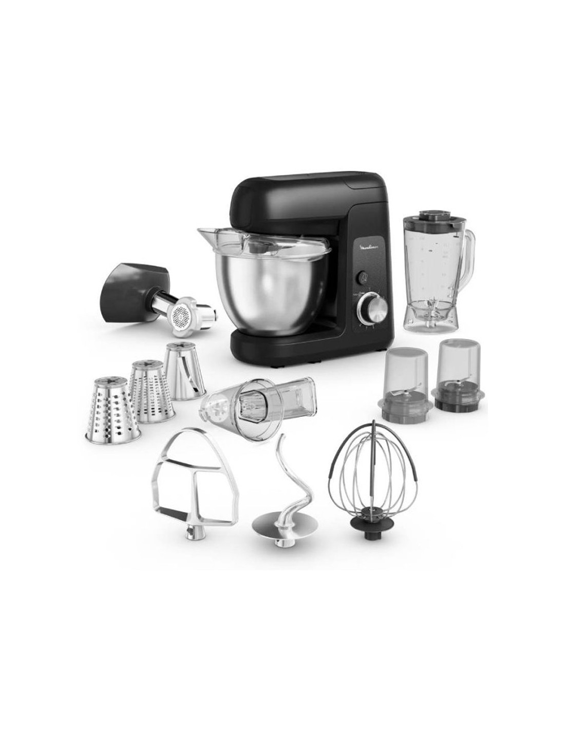 Ce robot pâtissier Moulinex comprend fouet souple, batteur, crochet pétrisseur, blender 1,25L, hachoir, râpe et mini hachoir. Tous les accessoires sont compatibles lave-vaisselle.
