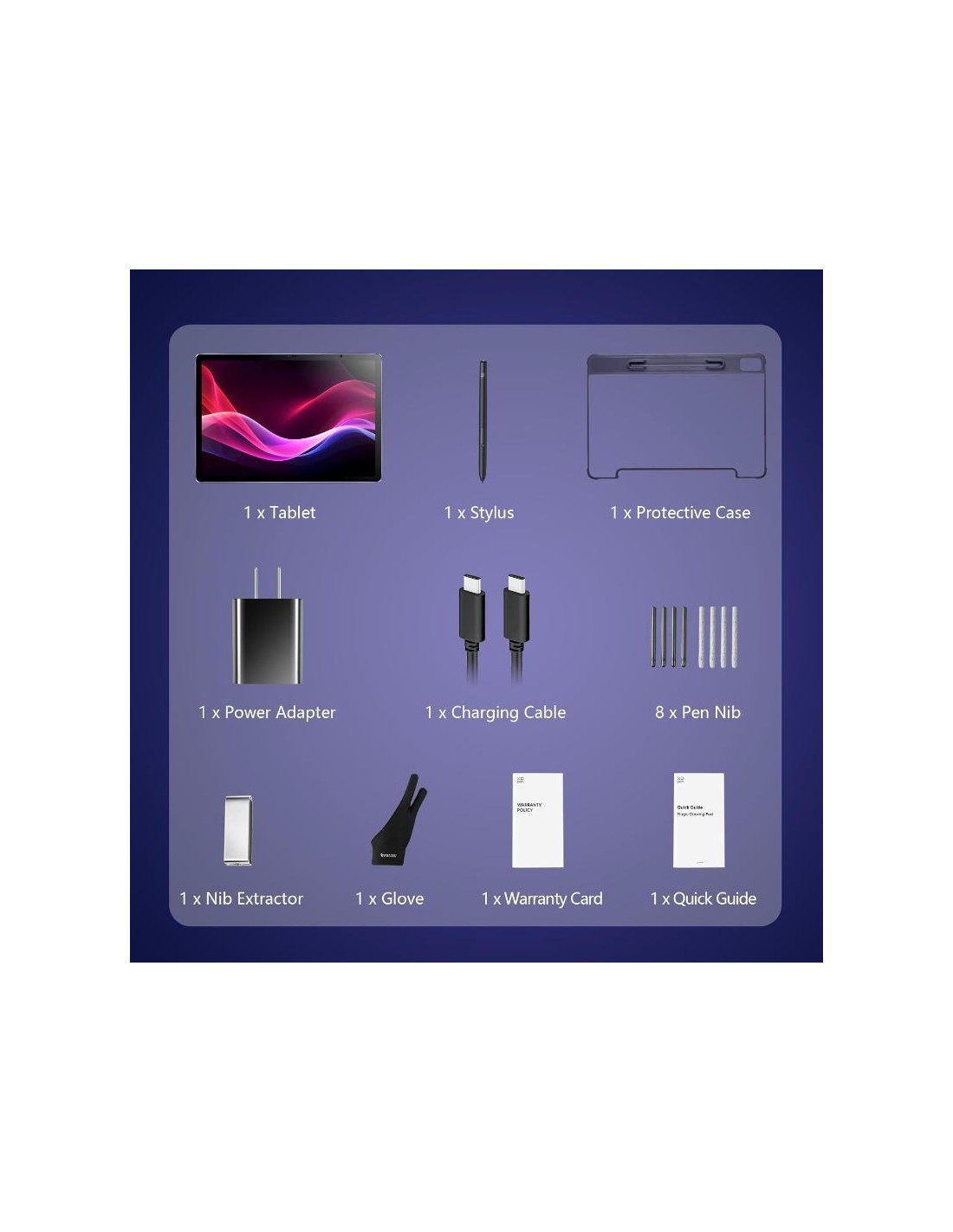 - Inclus : Tablette, Stylet, Gant, Adaptateur, Câble, 8 mines, Extracteur, Housse, Guide, Carte de garantie