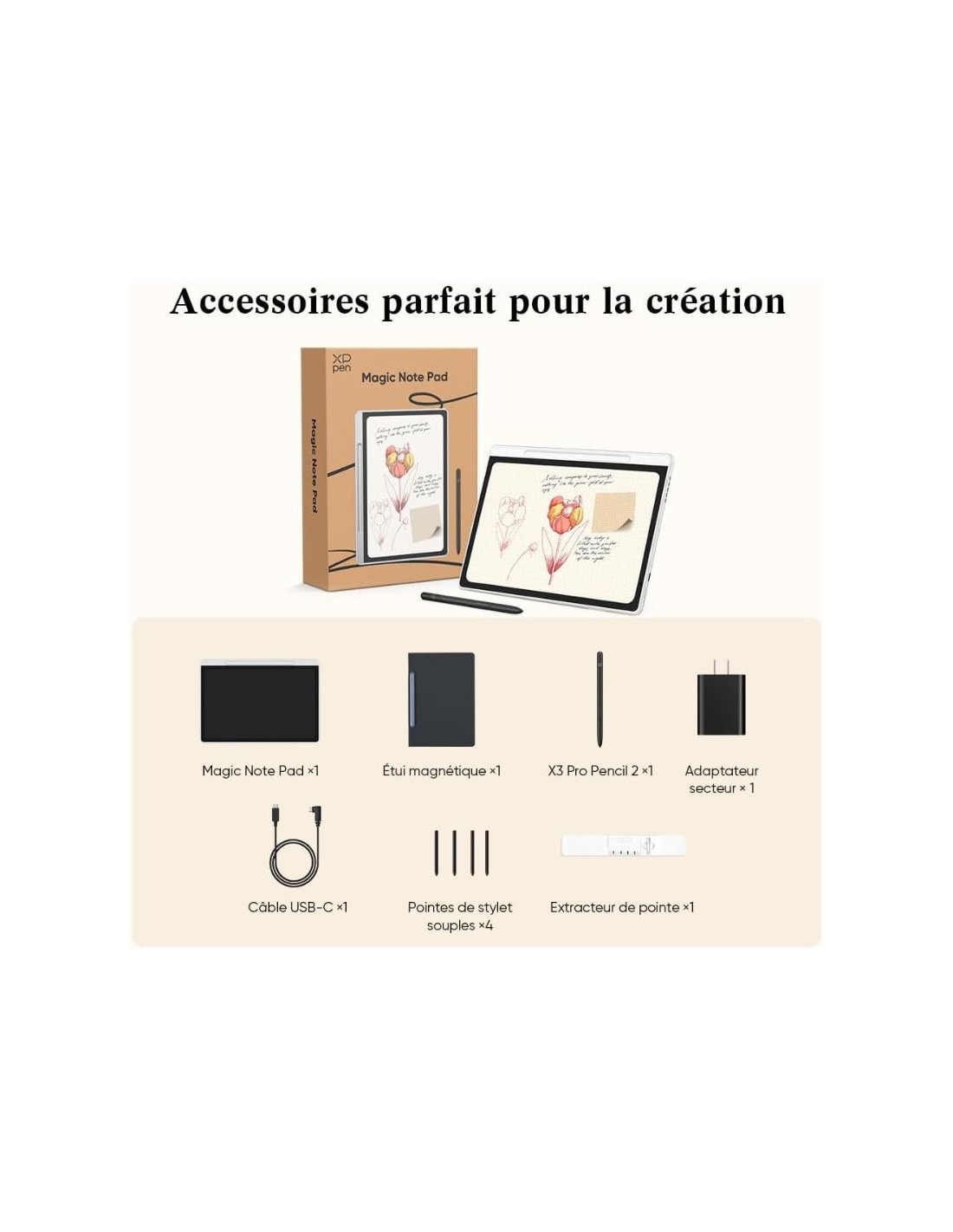 Le X3 Pro Pencil 2 accompagne la XP-PEN Magic Note Pad, offrant une précision de ±0,4 mm et 16384 niveaux de pression pour un confort optimal lors du dessin.