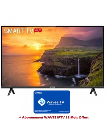 Téléviseur Full HD LED 40" - Smart TV - Android - Résolution 1920 x 1080 pixels - Luminosité 250 cd / m² - Contraste 4000: 1 - Temps de réponse 8.5 ms - Angles de vision (H/V): 178°/178° - Haut-parleur: 2x 8W - Wifi - Bluetooth - HDMI - USB 2.0 - Dimensions 1050 x 133 x 650 mm - Poids: 6.1 Kg - Garantie 2 ans Abonnement WAVES IPTV 12 mois Offert
