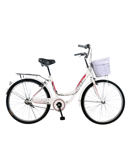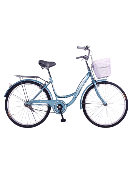 Réf : 10026001 - Vélo de route in-out city 1.0 26 - 26 pouce - jante en aluminium - garde boue av/ar - garde chaine - avec panier et porte bagage - large selle avec ressort - pneu et chambre à air de qualité - couleur : bleu /blanc/ miel.
