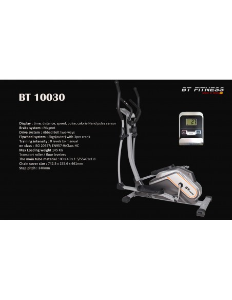 Réf : BT10030 - Écran d'ordinateur: Vitesse / Heure / Distance / Calories / Inclinaison / Pouls - Système de freinage: aimant - Système d'entraînement: Courroie côtelée - Système de volant à deux voies: 5 kg (extérieur) avec manivelle 3 pièces - Intensité de la formation: 8 niveaux par manuel - Poids d'utilisateur max: 120 kg - Taille du couvercle de chaîne: 742,5 x 155,6 x 461 mm - Pas de pas: 340 mm - Dimensions: 1300 x 550 x 1600 mm - Couleur: Gris - Garantie: 1 an.